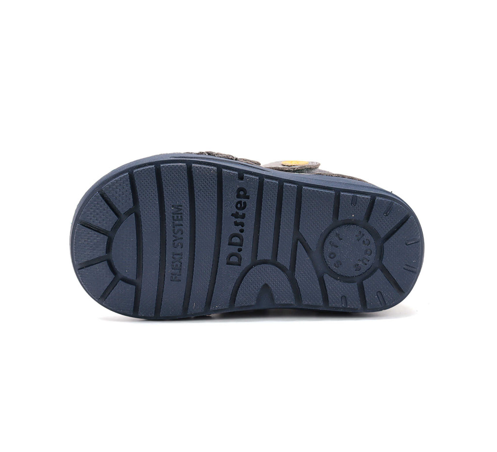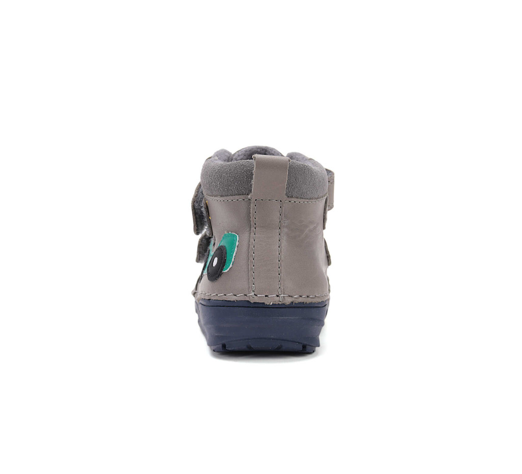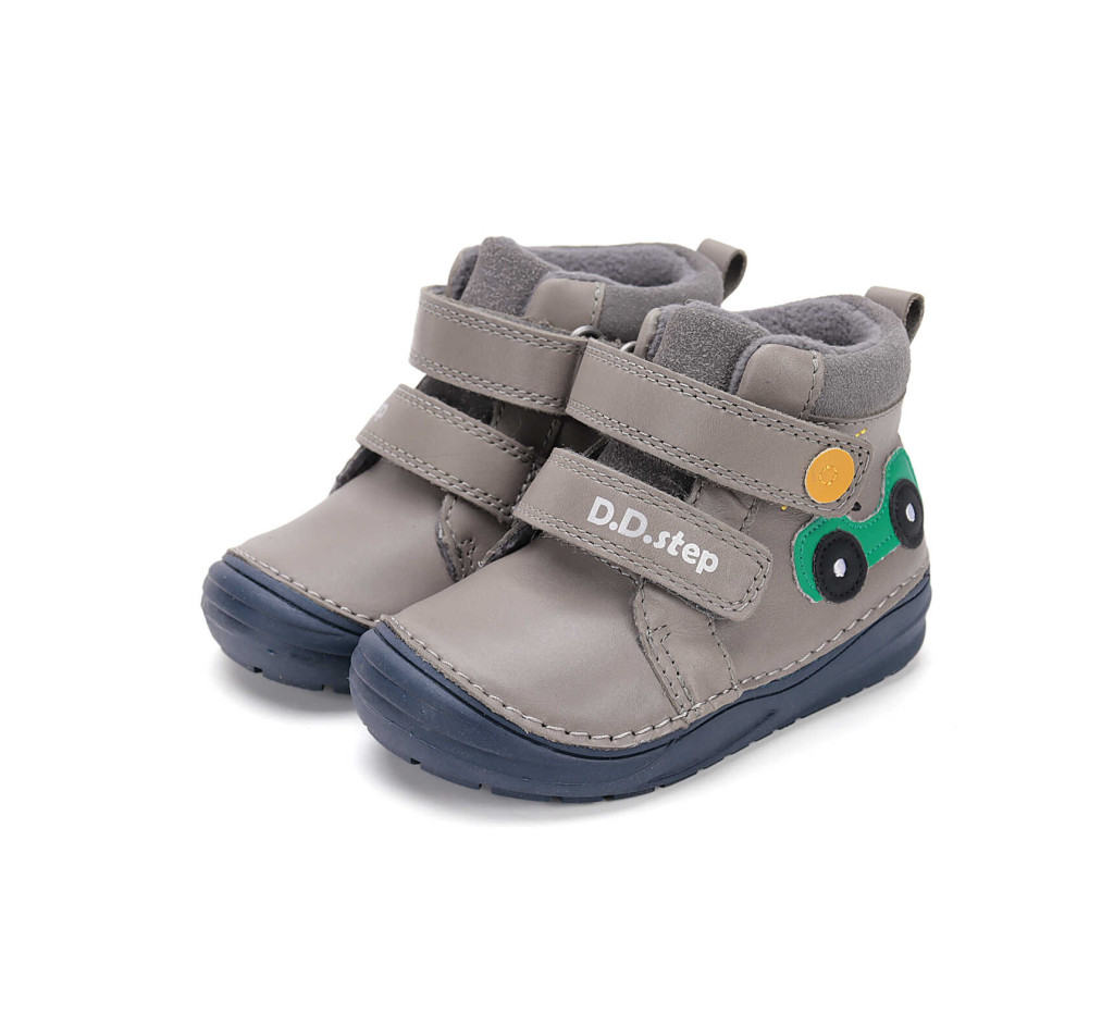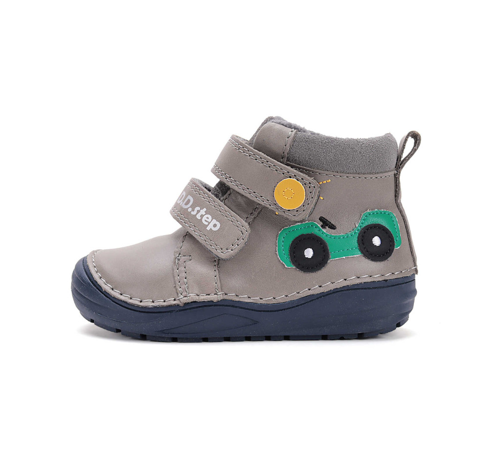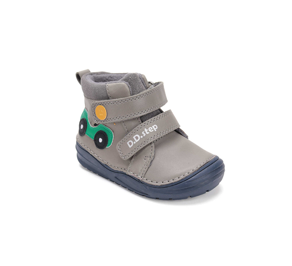 Ez a vidám és praktikus D.D.Step fiú cipő ideális választás a mindennapokra. A szürke bőr felsőrészt játékos zöld autós minta díszíti, amely minden kisfiú kedvence lehet. A közepesen magas szár extra tartást ad, miközben rugalmas talpának köszönhetően kényelmes és biztonságos járást biztosít.