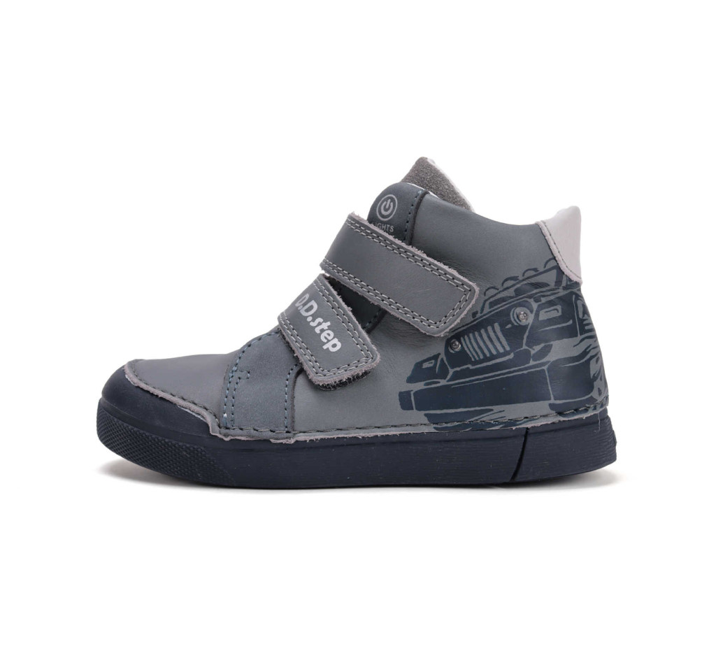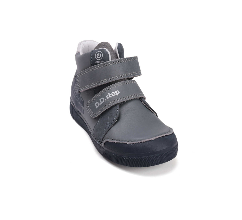 Ez a vagány D.D.Step LED-es fiú cipő minden kisfiú kedvence lesz! A szürke valódi bőr felsőrész és az autós minta már önmagában is különleges, de a mozgás közben felvillanó LED-fények teszik igazán izgalmassá. A gyerekek imádják a világító cipőket, és ez a modell garantáltan mosolyt csal minden kisfiú arcára.